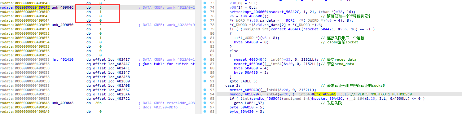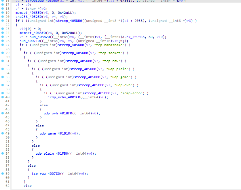 样本根据攻击者服务器回传的数据进行选择DDOS类型,其中数据中指定了该DDOS类型所需要的参数。