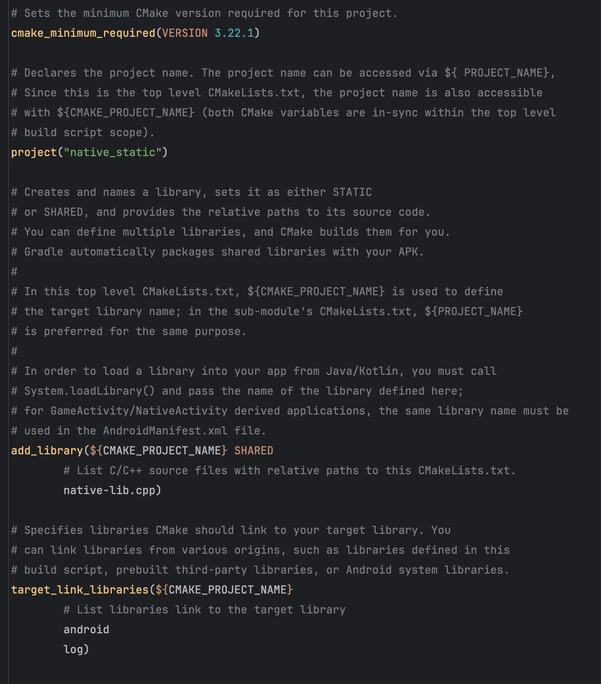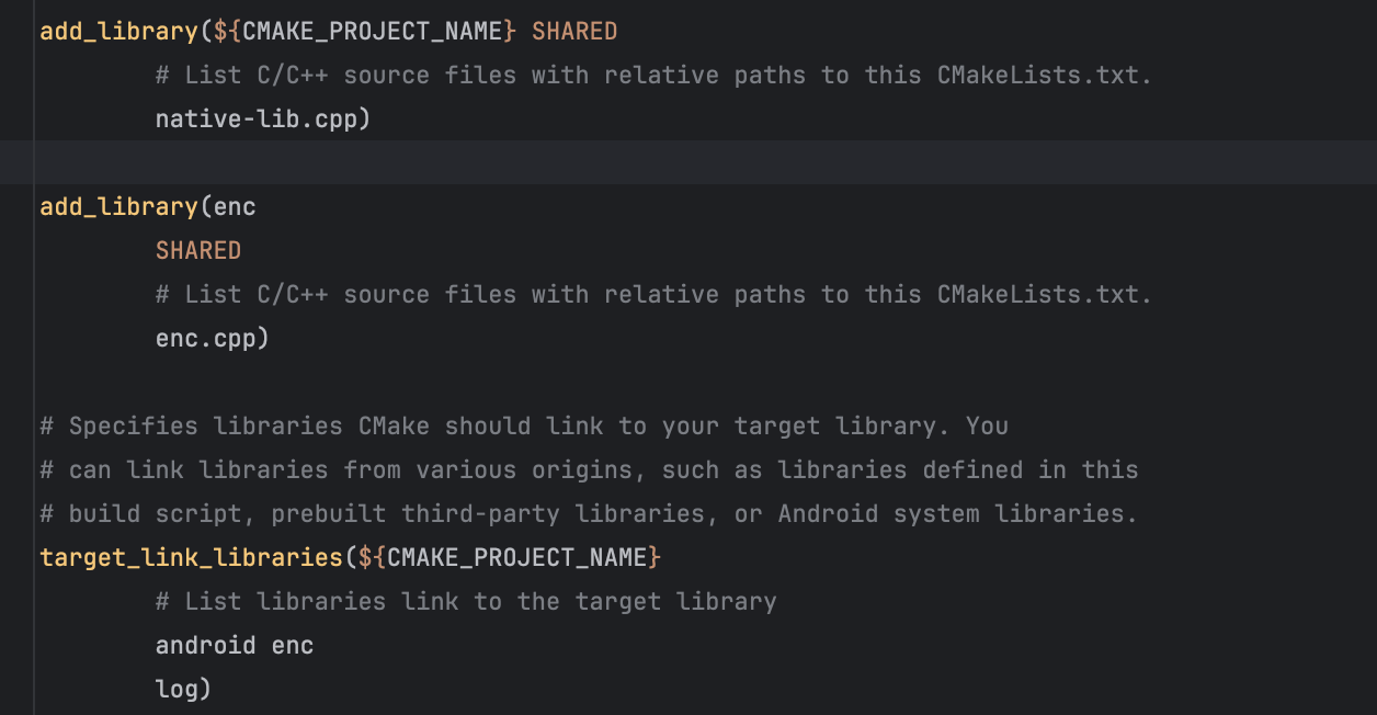 cmake_minimum_required:cmake的最低版本。project:项目名。add_library:欲添加的c库。在默认配置中含义为添加名为${CMAKE_PROJECT_NAME},src为native-lib.cpp这个库(编译产出为so文件,为linux动态链接库文件。)target_link_libraries:要链接的库,默认配置添加了${CMAKE_PROJECT_NAME}
