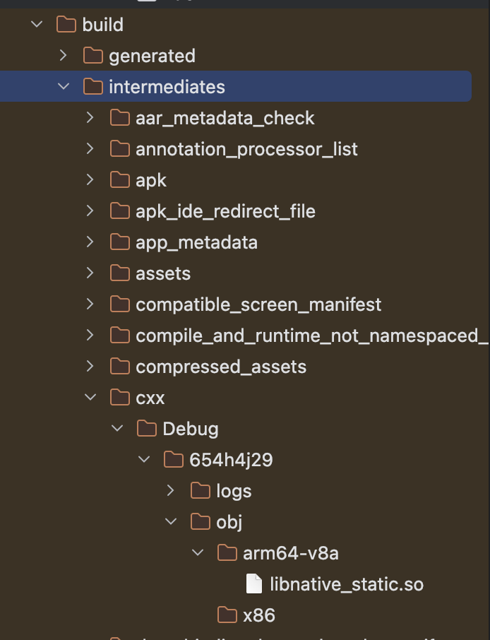 一旦工程编译,则会生成对应so文件在build/intermadiates/cxx/Debug/{xxxxx}/obj/{arch}/下,例如项目默认的so为libnative_static.so。