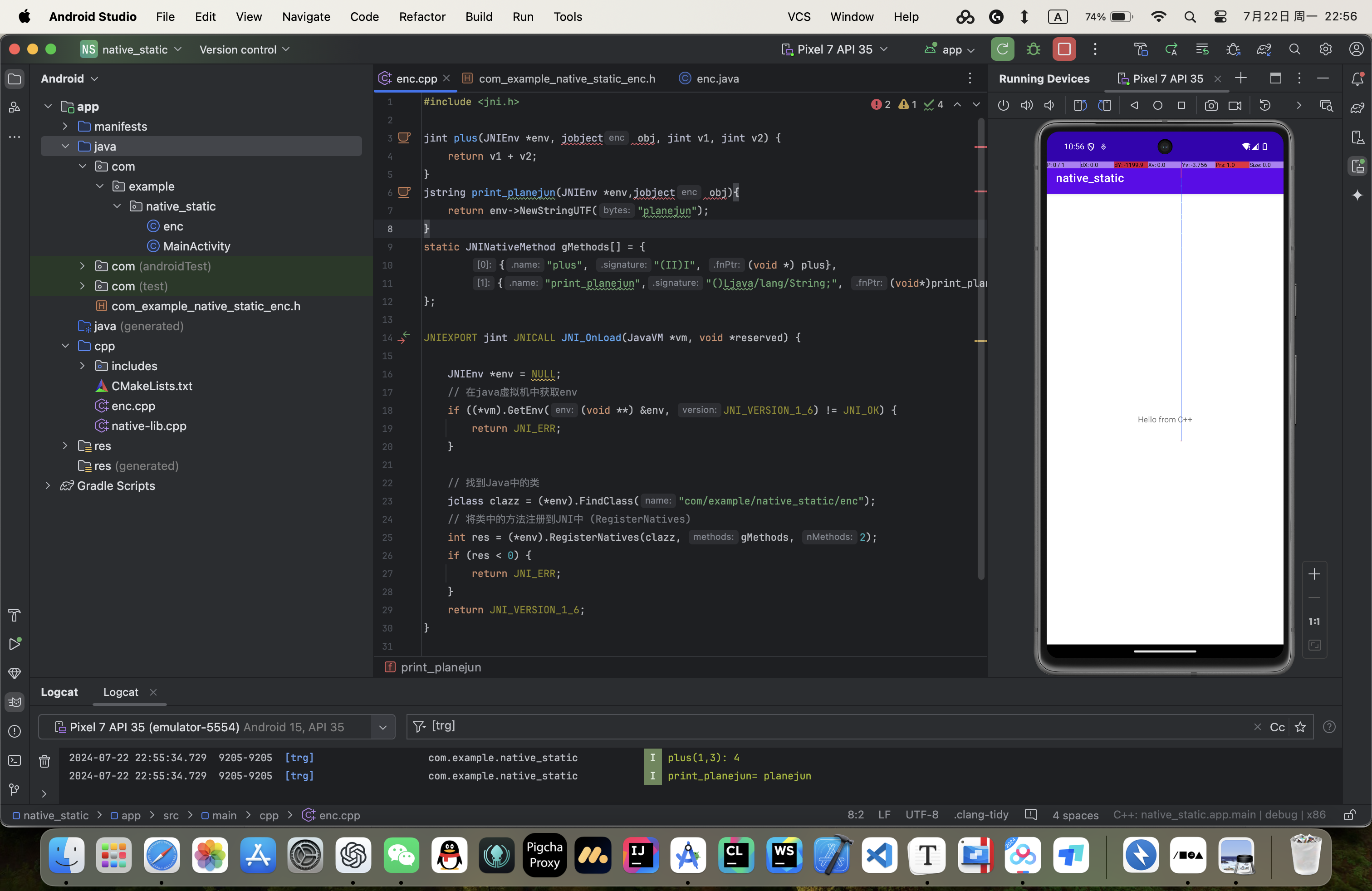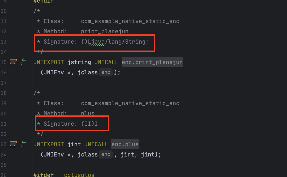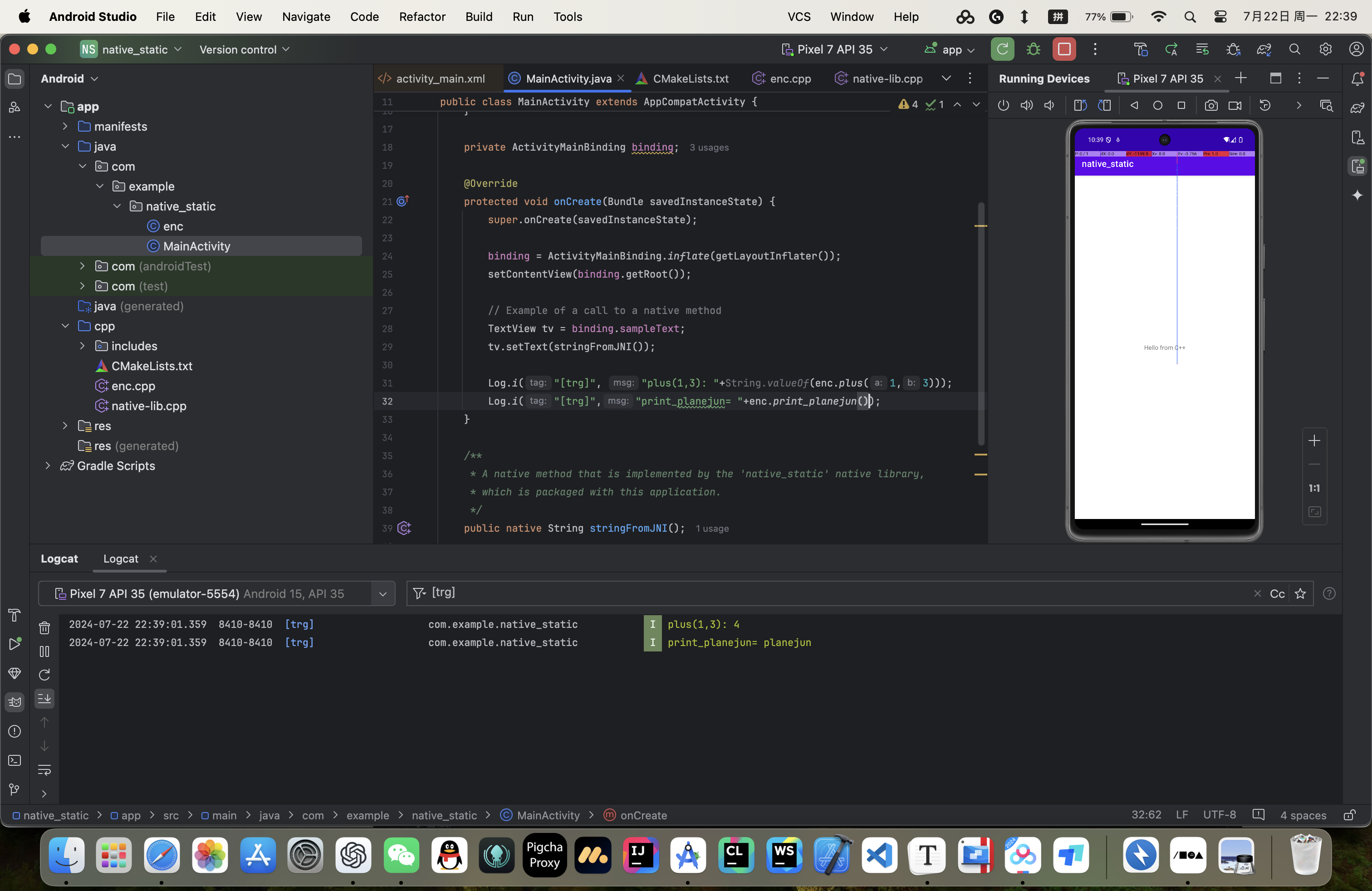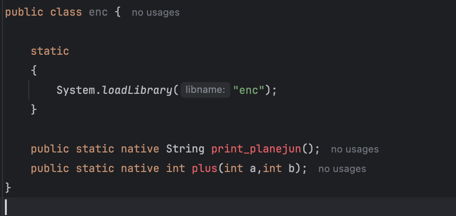 System.loadLibrary("enc");表示要加载这个库文件。然后按照相同的方法创建对象体,并实现代码。