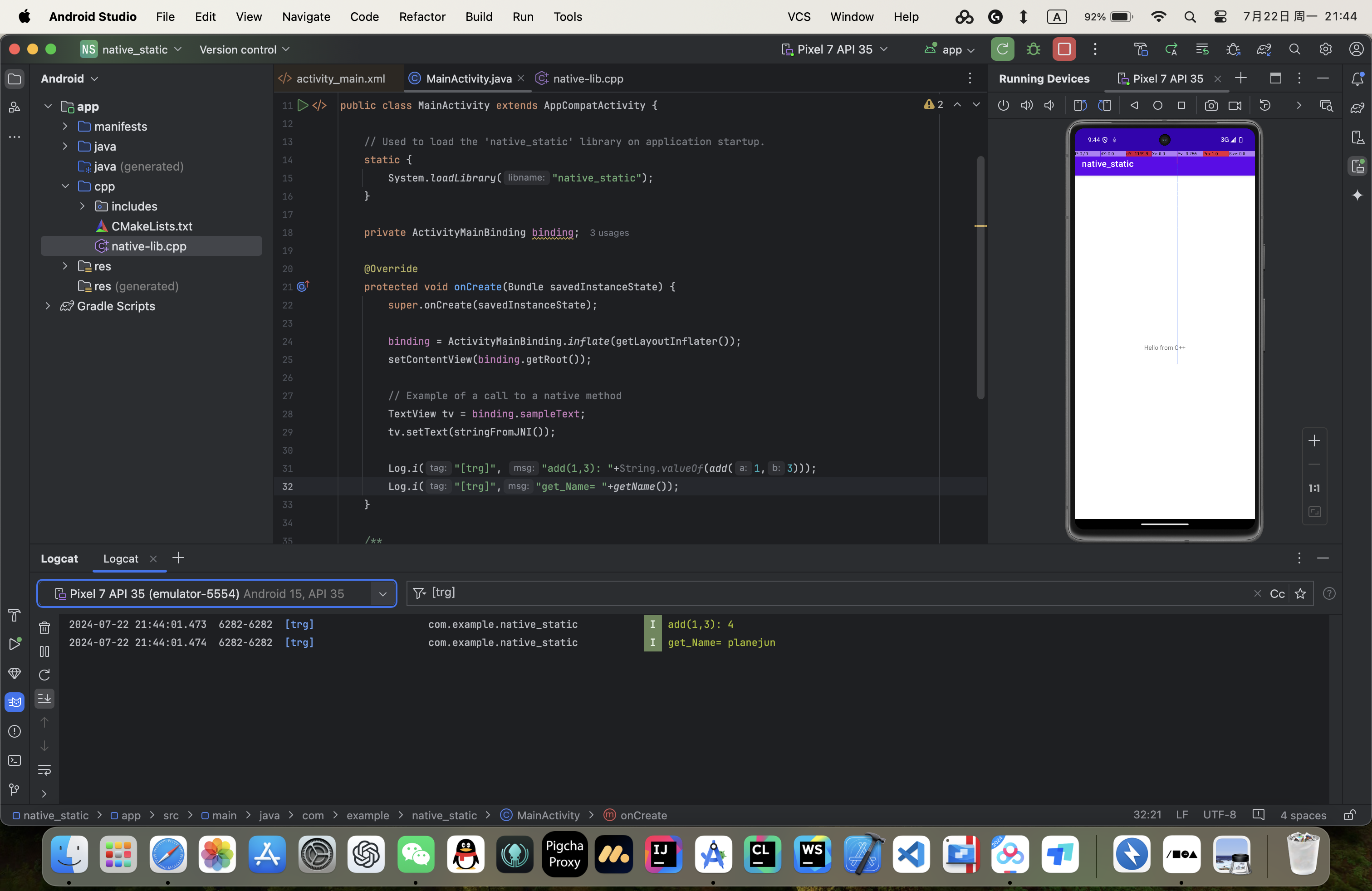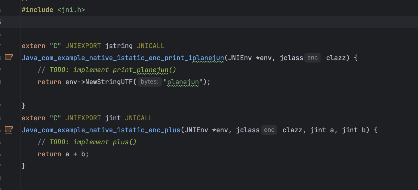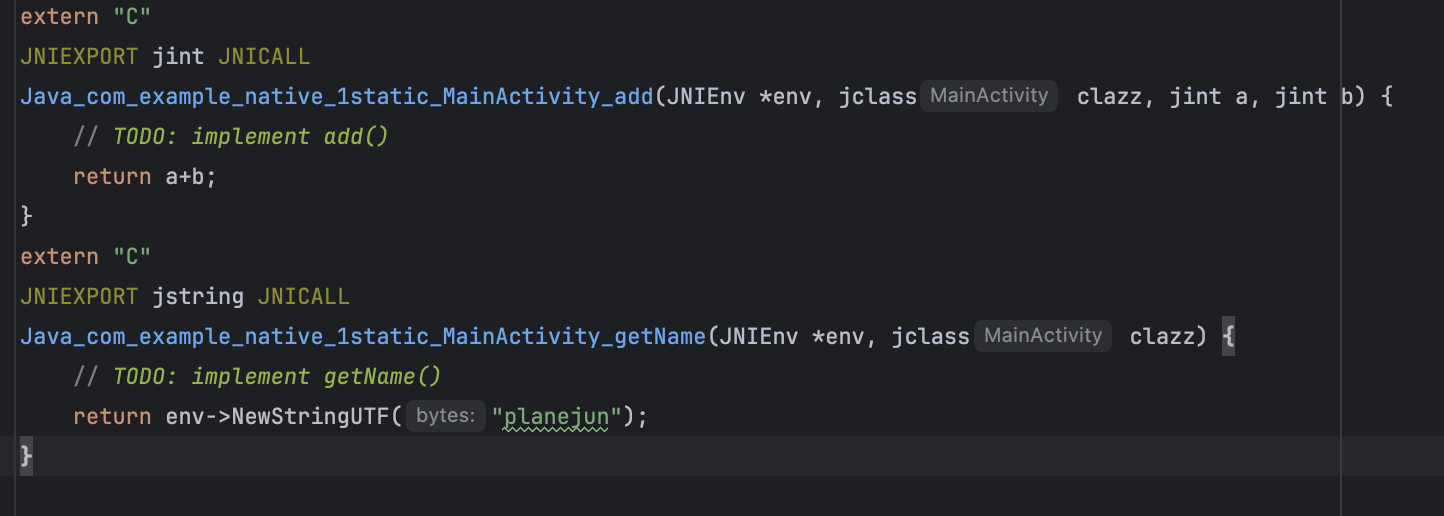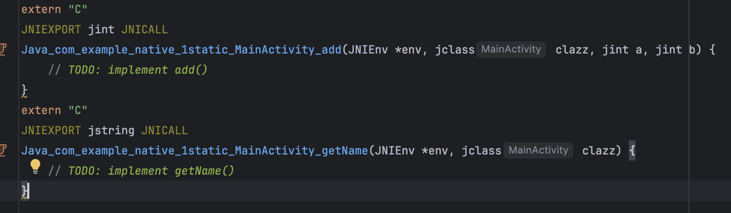 jni类型的函数名为:Java_包名_1static_类名_函数名,其中头文件jni.h为必须引入。回到MainActivity.java中自己添加两个函数。