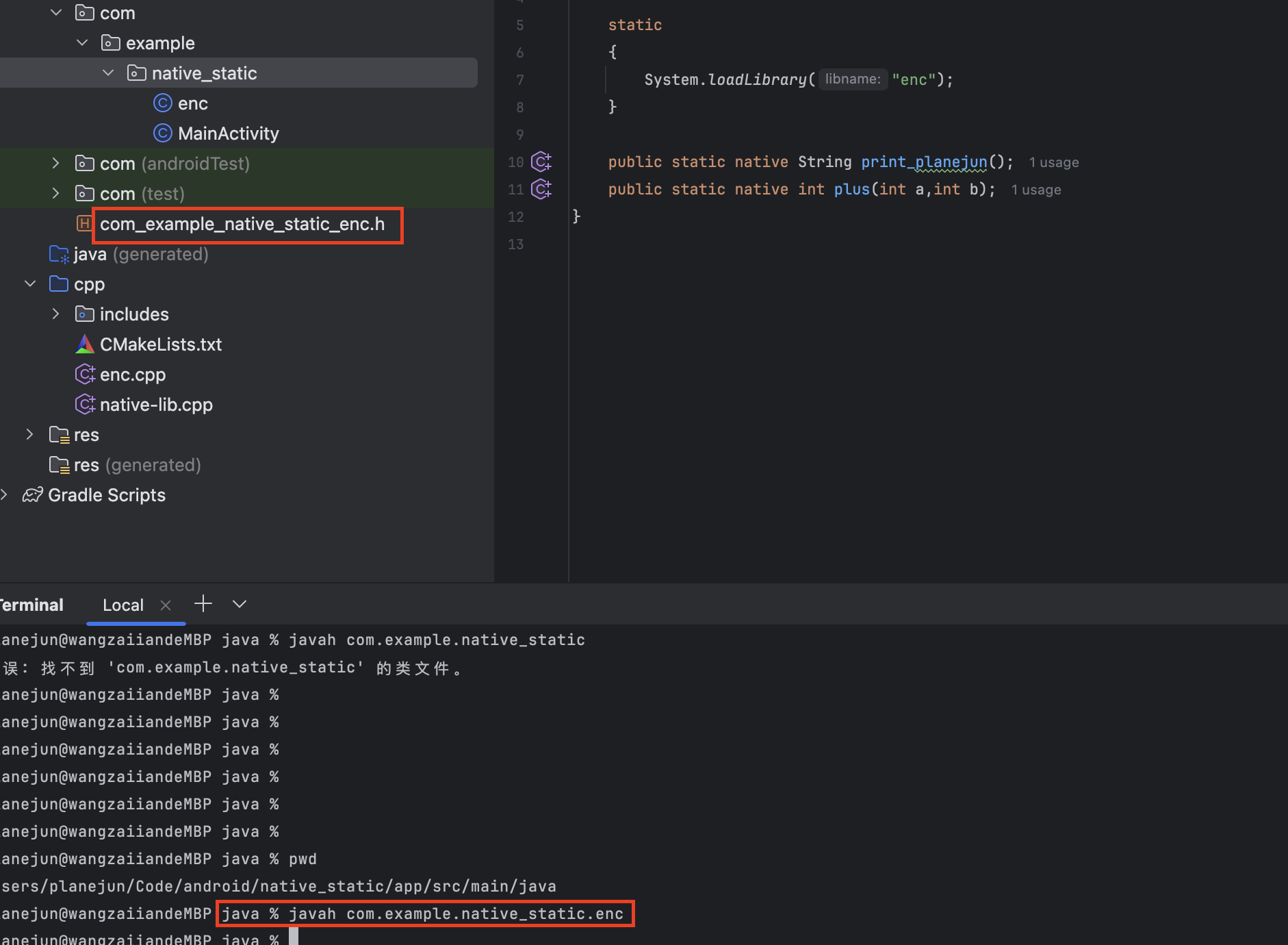enc.java:用来声明native函数。enc.cpp:用来定义native函数实现。