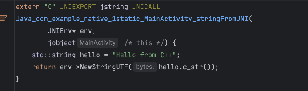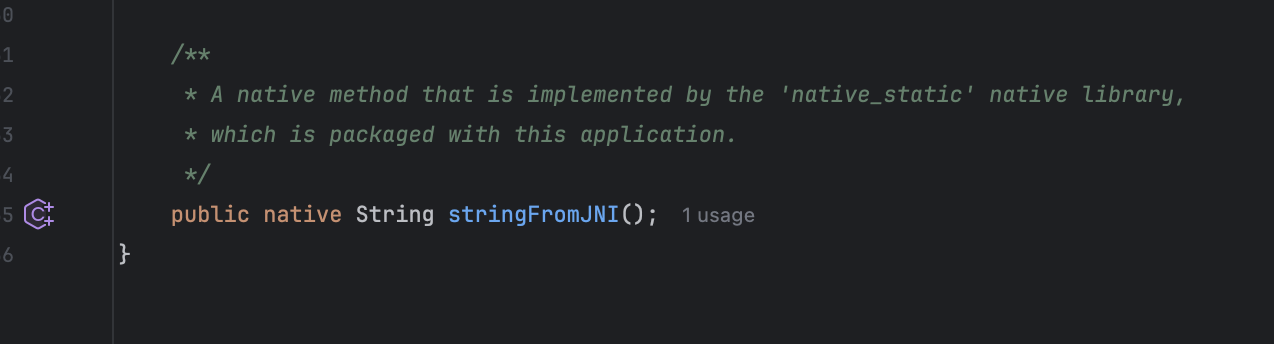 项目创建完毕后,可以在MainActivity.java中看到有一个native修饰stringFromJNI函数。