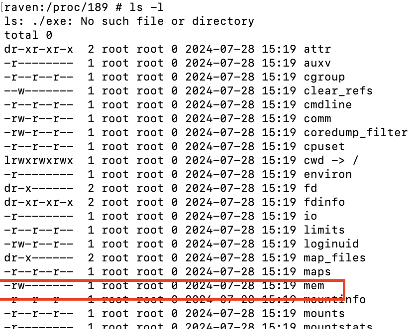 其他目录不做解释,mem代表为进程内存,因此可以通过linux的io命令打开以为文件形式读写。