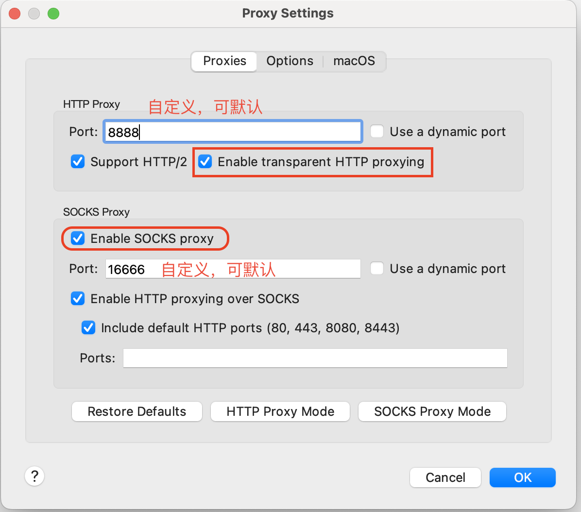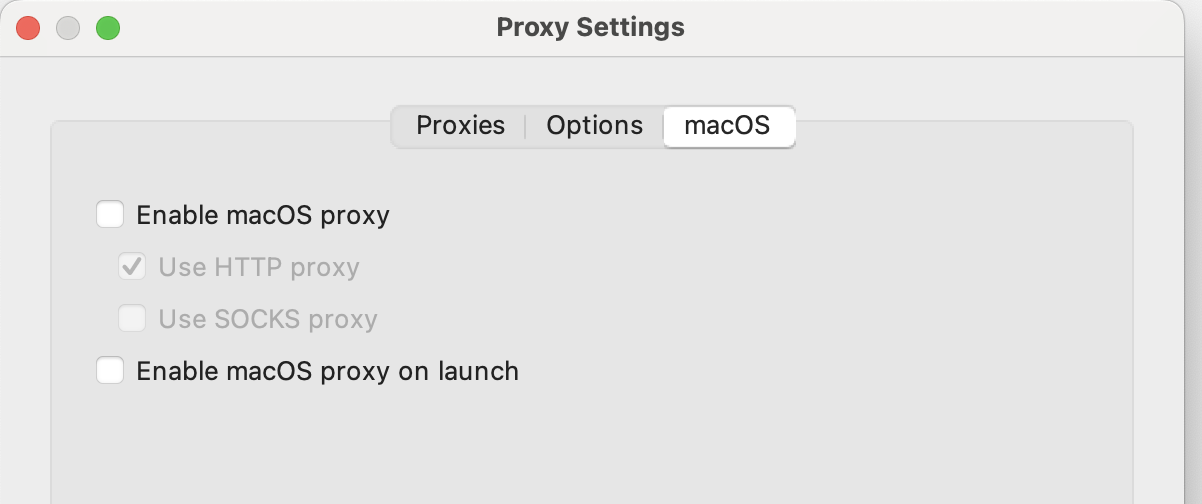 然后是关闭启动时自动开启:Proxy→Proxy Settings,取消勾选Enable macOS proxy on launch。