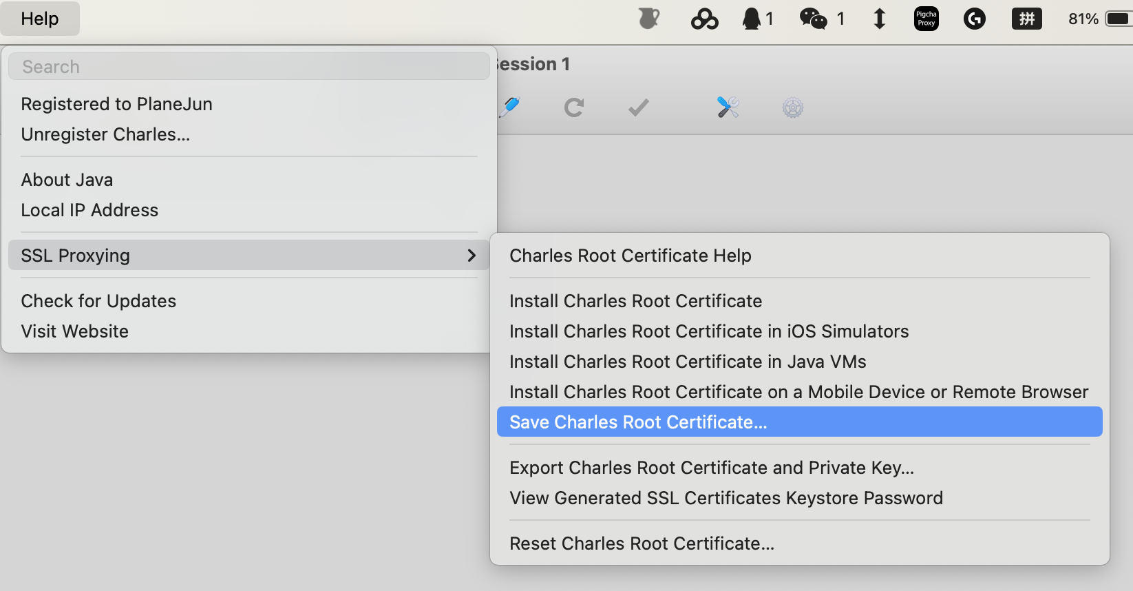 Help→SSL Proxying,然后这里可以选择Save Charle Root Certificate,也可以选择第四个install charles root ..... remote browser(这个具体操作就不说了)。