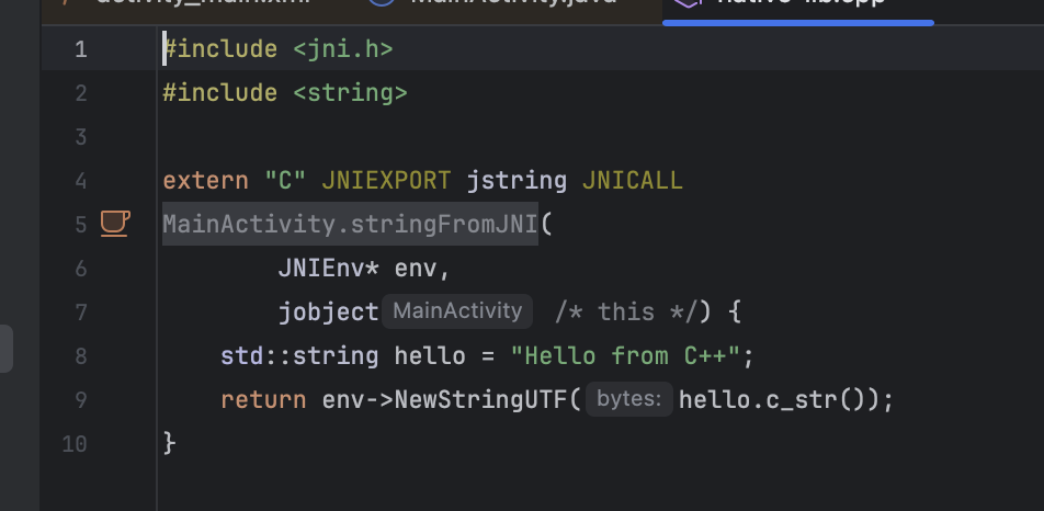 并且可以在左边的项目结构中看到有cpp文件夹,展开后可以看到有一个native-lib.cpp文件,双进进入可以看到有一个函数实现。