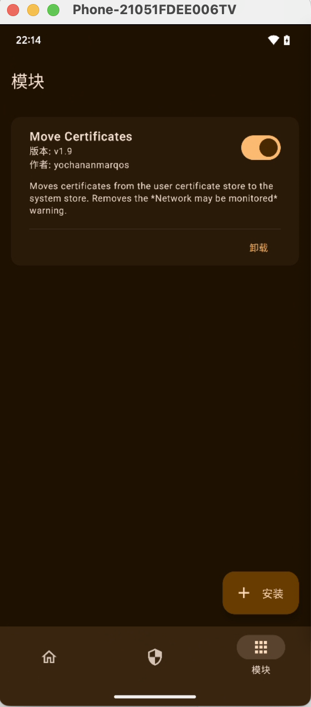 使用KernelSU或者面具安装这个模块,这个模块主要作用就是把用户证书自动移动到系统证书中(安装证书后,需要重启手机生效)。