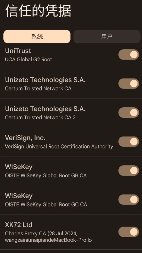 首先安装证书后,重启手机,然后到系统级证书查看。