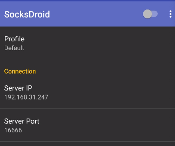 Server IP依旧填写上边获取到的IP,Server Port则填写第一步中SOCKS Proxy中设置的端口。然后点击右上角的开关,开启即可。
