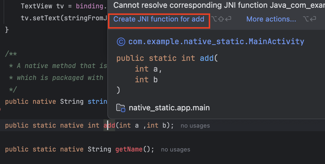根据提示点击Create JNI function for add会自动生成对应函数体。
