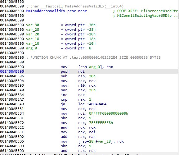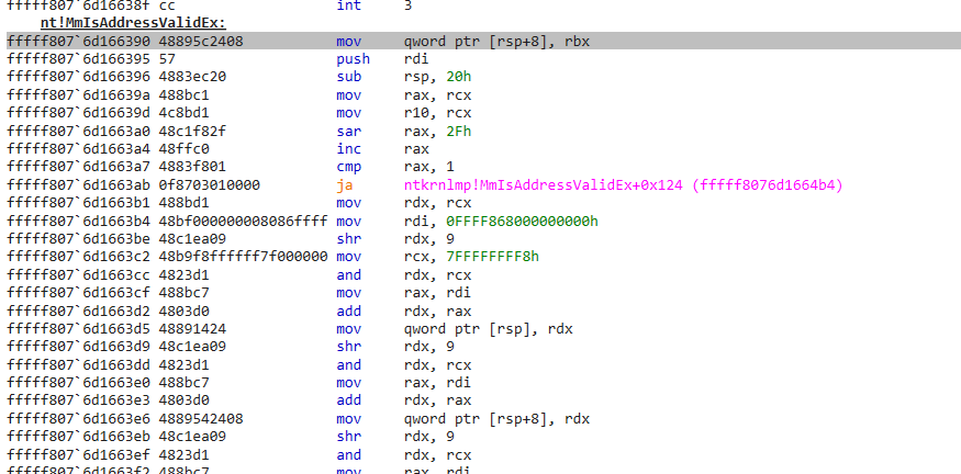 ida打开ntoskrnl.exe,跳转到函数MmIsAddressValidEx。