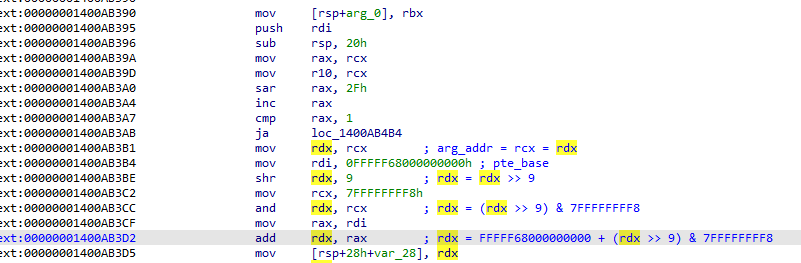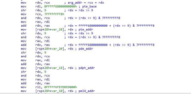 | pte_base = FFFFF68000000000 + (arg_addr >> 9) & 7FFFFFFFF8 rdx = FFFFF68000000000 + (pte_base >> 9) & 7FFFFFFFF8