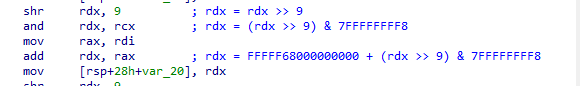 其中由上边自映射原理可知,该处实际上为计算参数地址的pte地址保存至[rsp]中。这里计算的方式与上边表达式有差异但实际上相同,0x7FFFFFFFF8为去除高16位后再去除后3位,继续往下分析。