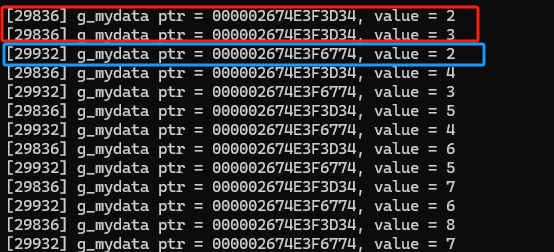 可以看到两个线程中,g_mydata的地址和数据都互不相同,且不干扰。