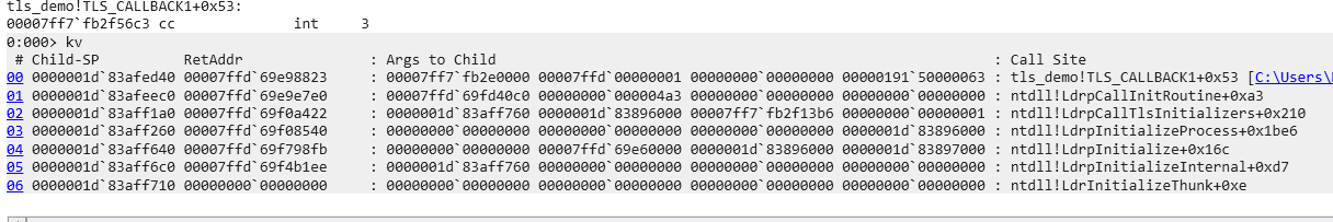 给TLS_CALLBACK1函数添加一个int3断点,然后使用windbg挂起。