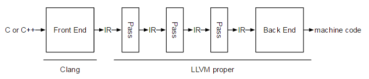 O-llvm是基于llvm进行编写的一个开源项目(https://github.com/obfuscator-llvm/obfuscator),它的作用是对前端语言生成的中间代码进行混淆(反优化),目前在市场上,一些加固厂商(比如360加固宝、梆梆加固)会使用改进的O-llvm对它们so文件中的一些关键函数采用O-llvm混淆,增加逆向的难度。因此,掌握O-llvm的实现过程,是很有必要的。O-llvm总体构架和llvm是一致的,如下图所示。