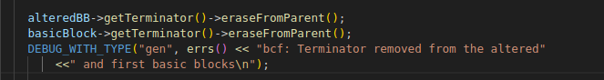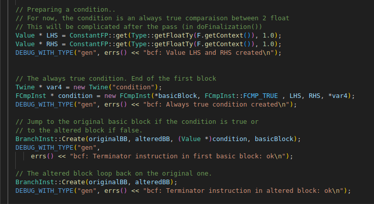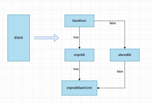 创建了一条if(1.0f == 1.0f)的语句,将其连接到originalBB和alteredBB上,并设立条件成立的时候执行originalBB。