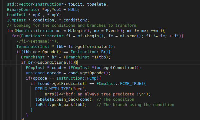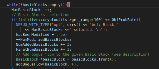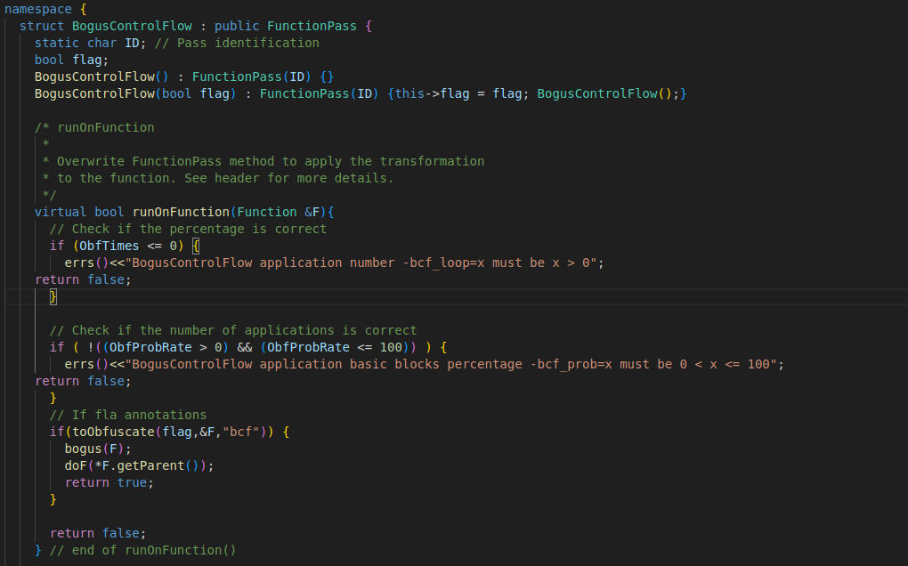 字面意思,在原控制流上造出几个假的流程,在真实执行的时候不会执行这些分支,纯属充当搅屎棍。打开文件后可以看到BogusControlFlow继承于FunctionPass,表明这是一个函数的pass,并且重写了runOnFunction函数。该函数为入口函数,传入的对象实际上就是被结构化的函数实体,所有的处理都从这里开始。
