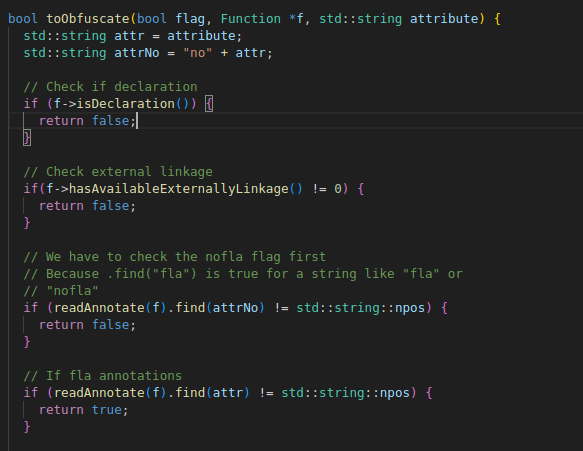 int func() __attribute((__annotate__(("参数三"))));,如果存在则混淆。(若从命令参数指定-boguscf则为全局混淆)