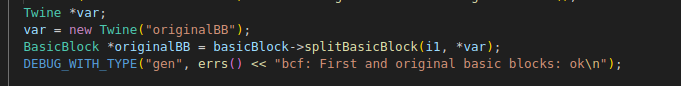 接着调用函数splitBasicBlock以il为界限切割,这样就得到了两个BB,其中Twine可以看做字符串,即新产生的BasicBlock的名称。